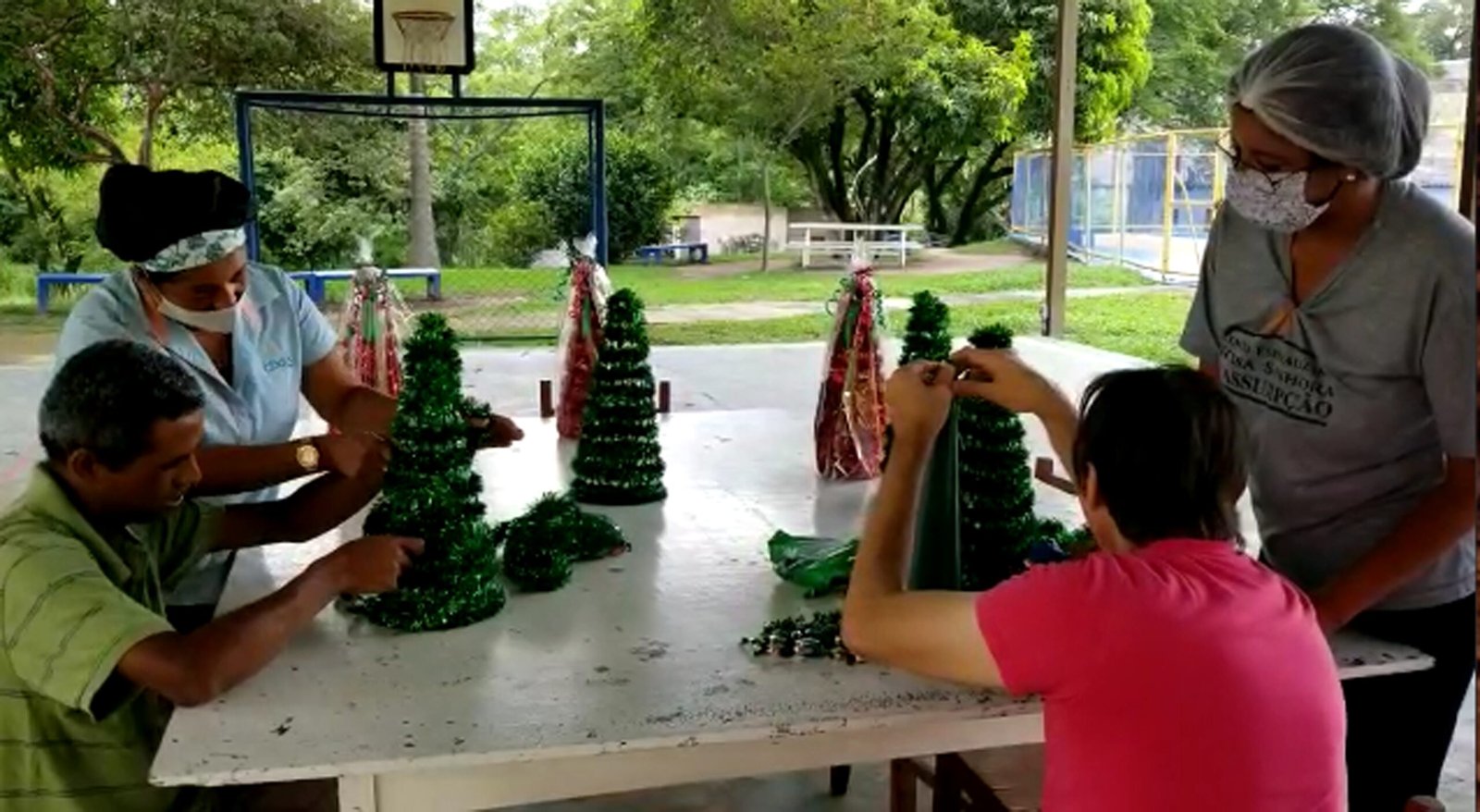 Confecção de árvores de Natal artesanais é parte do processo terapêutico de pessoas com deficiência intelectual em MG